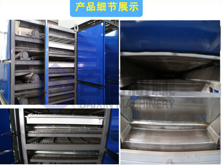 烘室為箱體式,承載物料的網帶為不銹鋼網,機門為鍍鋅鋼板,表面噴漆保護,中間鑲嵌保溫材料。 鏈條為合金鋼套筒滾子鏈,速度兩級設計,前快后慢,能滿足不同干燥工藝要求。